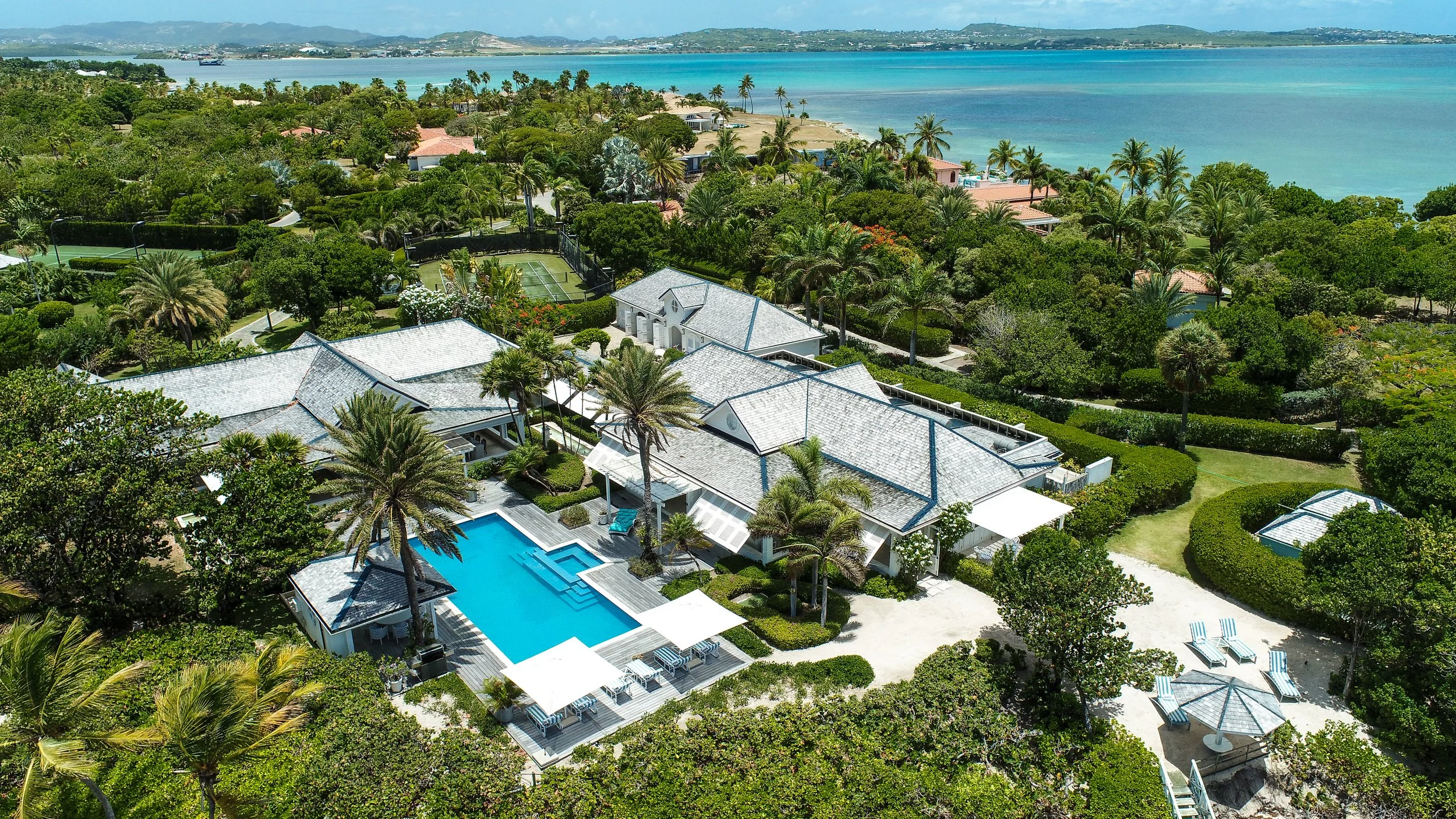 Ideally situated on Pasture Bay, the home occupies one of the most private beach front acreages on Jumby Bay island. With the wide-open uninterrupted horizon of the Caribbean Sea to the north, the property commands an extraordinary and unique vista which provides the estate with its name - Blue Horizon.